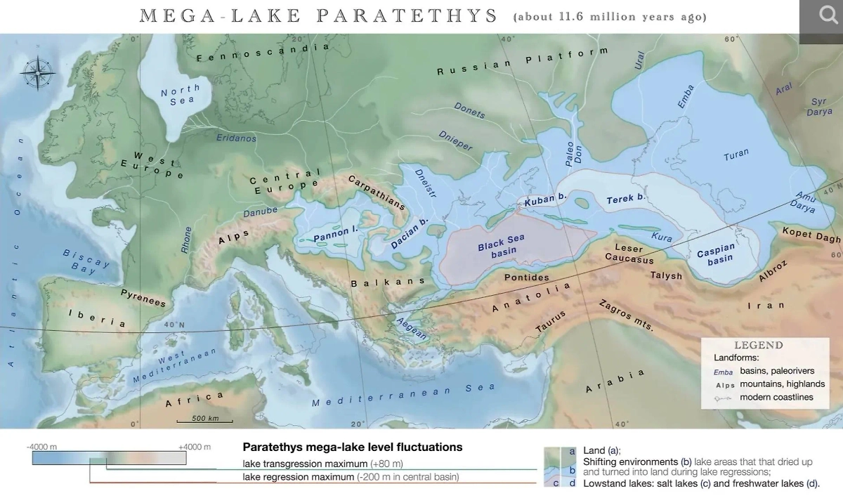 Расчёты, сделанные учёными из Утрехтского университета в Нидерландах вместе с их коллегами из Бразилии, России и Германии, указывают на то, что площадь вод древнего Паратетиса достигала 2,8 миллиона квадратных километров. Это больше, чем в современном Средиземном море. Существовавший примерно 11 миллионов лет назад бассейн раскидывался от Альп на западе до Туркменистана на востоке, или, как ещё говорят, "от Парижа до Алтая". Этот древний океан содержал в десять раз больше воды, чем все вместе взятые озёра наших дней. Когда Паратетис начал иссыхать, на его месте появились три моря — Чёрное, Каспийское и Аральское.