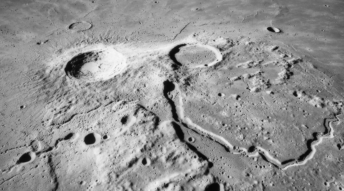 Лунные кратеры Аристарх (в центре) и Геродот (справа) на снимке с борта корабля "Аполлон-15". Фото © Wikipedia / Фото с борта "Аполлона-15"