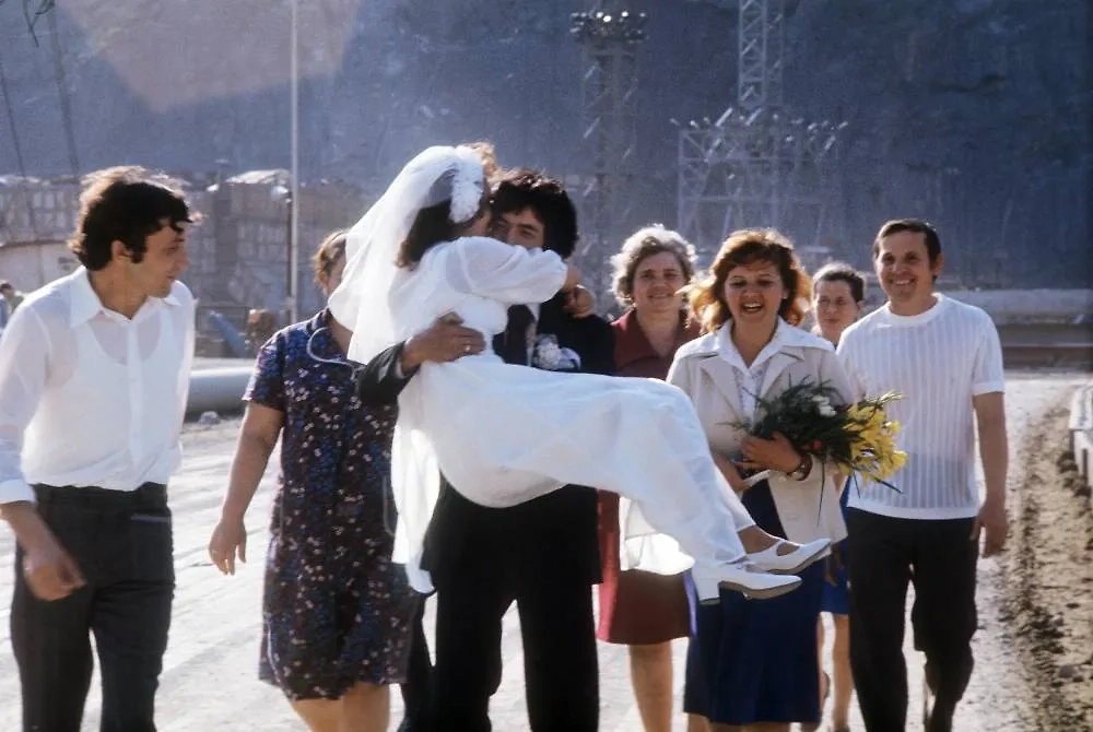 Июль 1977 г. Свадьба строителей Саяно-Шушенской гидроэлектростанции на строительной площадке.