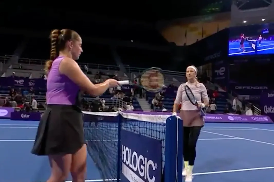 Латвийская теннисистка Елена Остапенко проиграла белоруске Виктории Азаренко и после матча отказалась жать ей руку. На видео — то, как представительница прибалтийской республики вместо ладони выставляет перед ней ракетку. Встреча состоялась в рамках 1/8 турнира в Дохе.