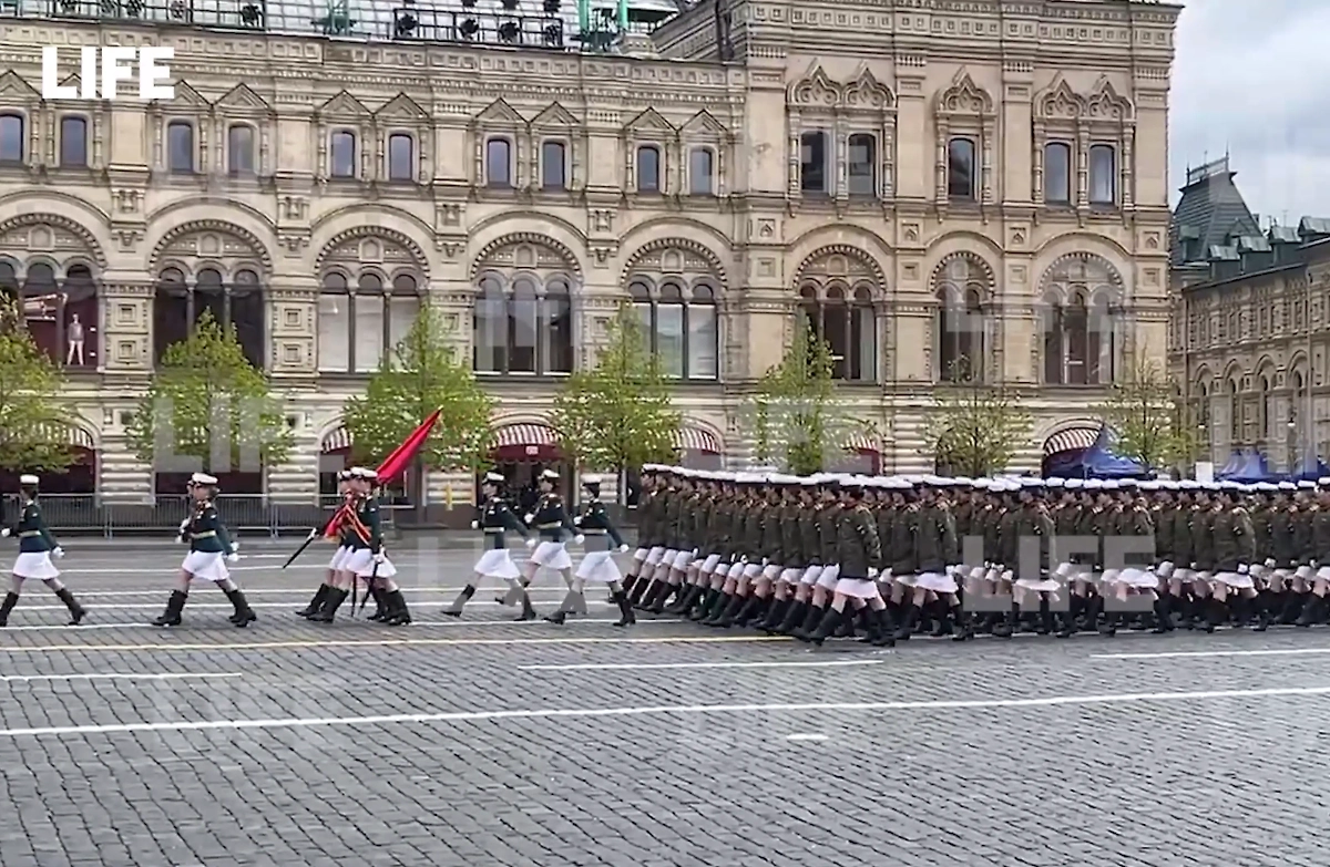 Начиналась репетиция с внесения на площадь почётным караулом Государственного флага РФ и Знамени Победы — боевого знамени 150-й стрелковой Идрицкой дивизии. В наши камеры попали пешие парадные расчёты. Особое внимание привлекла колонна девушек-военнослужащих. Также по Красной площади строем пройдут полки, батальоны и роты по видам и родам войск, расчёты от суворовских, нахимовских, кадетских и музыкального училищ, юнармейцев, казаков и сводный военный оркестр. И, конечно, в пешей колонне бойцы спецоперации на Украине. Участники шествия на репетиции потренировали и могучее троекратное "Ура" — прямо как на историческом параде с маршалом СССР Георгием Жуковым в 1945 году.