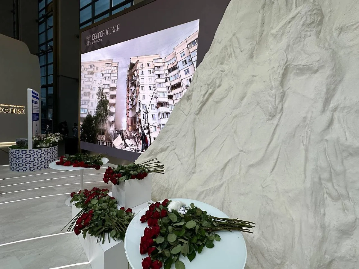 На выставке "Россия" на ВДНХ стенд Белгородской области усыпан цветами. Сегодня там почтили память погибших в результате массированных обстрелов Вооружёнными силами Украины.