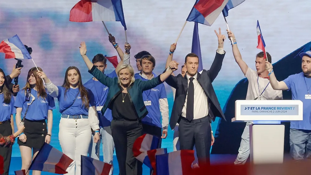 Лидер парламентской фракции партии "Национальное объединение" Марин Ле Пен (слева на первом плане) и председатель партии Жордан Барделла (справа на первом плане). Обложка © ТАСС / ЕРА / ANDRE PAIN