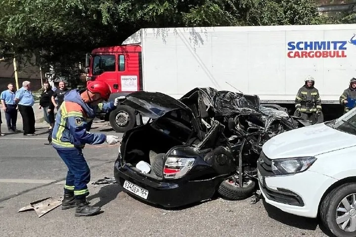 Около 15:00 на улице Соколовая у дома № 76 столкнулись грузовик Man и две Lada Granta. Фото © Служба спасения Саратовской области