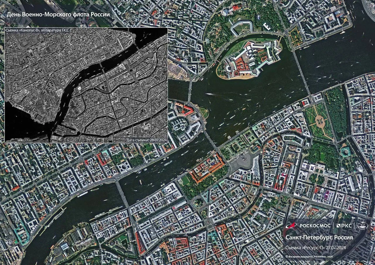 Госкорпорация "Роскосмос" показала фото со спутника "Ресурс-П", на котором изображена Северная столица РФ во время Главного военно-морского парада России.