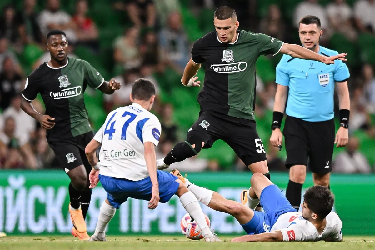 Момент из матча "Краснодар" — "Динамо" Махачкала, 28 июля, 2024 год. Обложка © Telegram / ФК "Краснодар"
