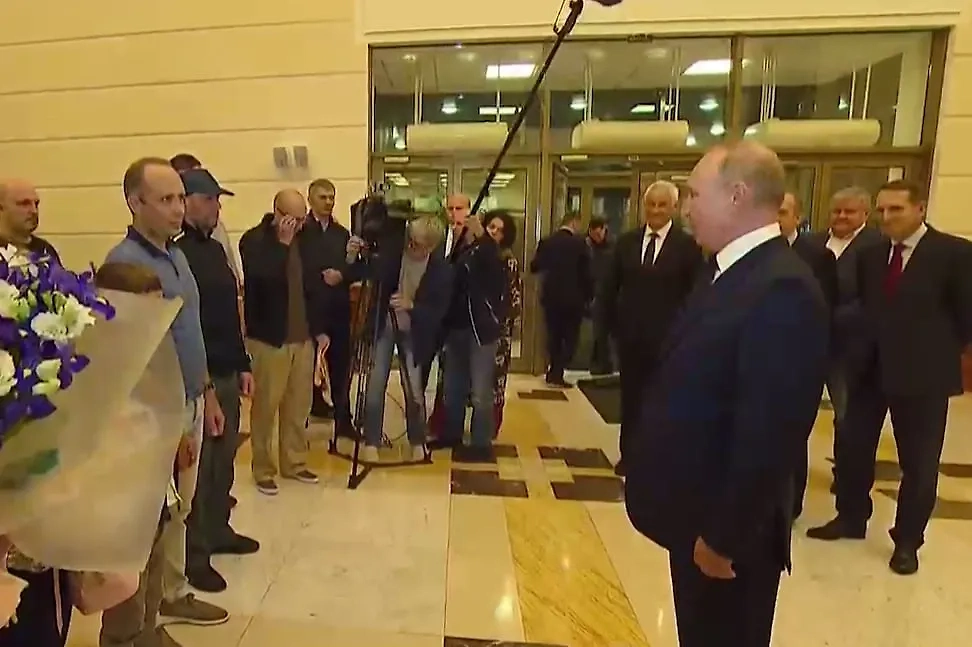 Президент РФ Владимир Путин встретил в аэропорту Внуково-2 освобождённых россиян. На видеозаписи с места событий можно увидеть, что ему на этом мероприятии составили компанию директор ФСБ Александр Бортников, руководитель Службы внешней разведки России Сергей Нарышкин и глава Минобороны РФ Андрей Белоусов.