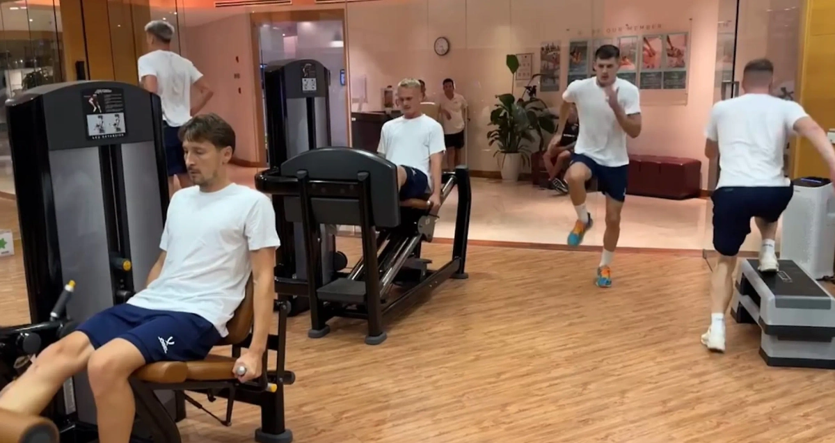 Футболисты сборной России коротают время в тренажёрке отеля, где их запер тайфун «Яги»