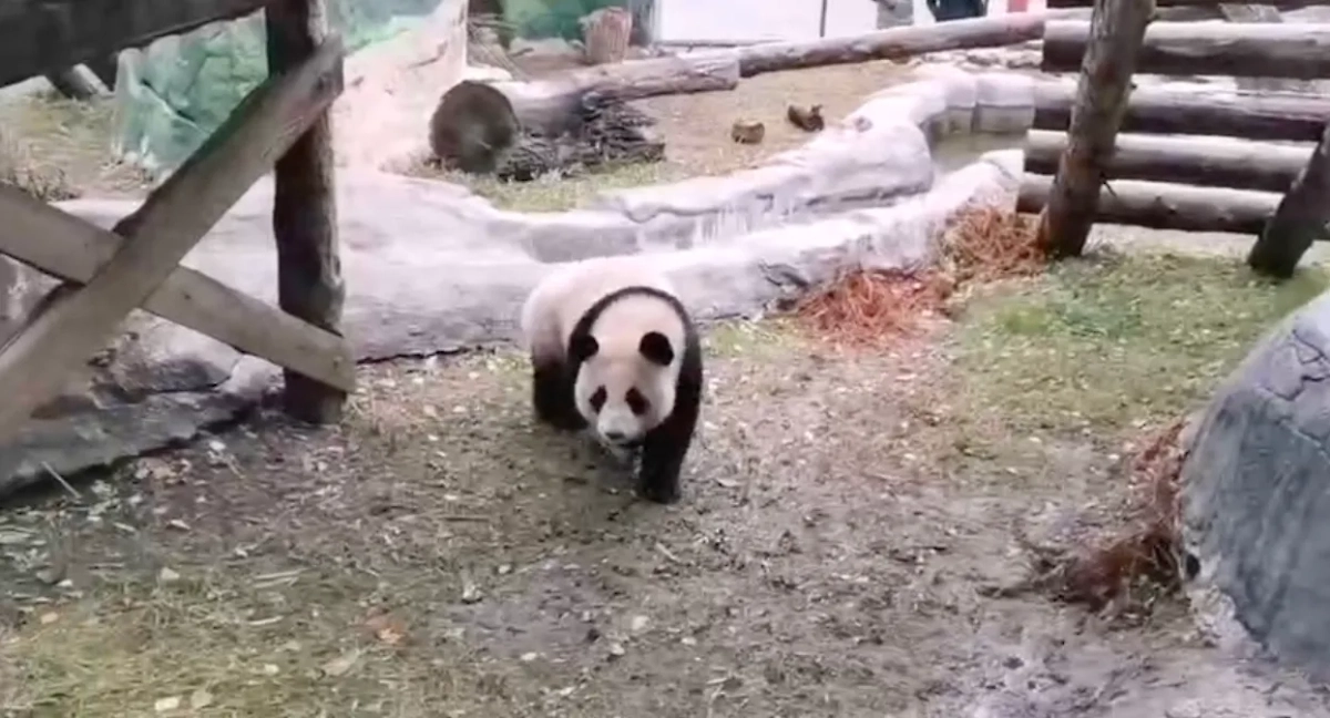 В Московском зоопарке панда Катюша впервые совершила прогулку в вольере отца Жуи