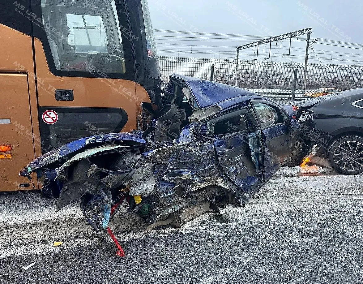 Один из автомобилей смялся, как алюминиевая банка, когда его протаранил автобус. Из-за страшной аварии движение перекрыли, на трассе пробки. О пострадавших ничего не сообщается.