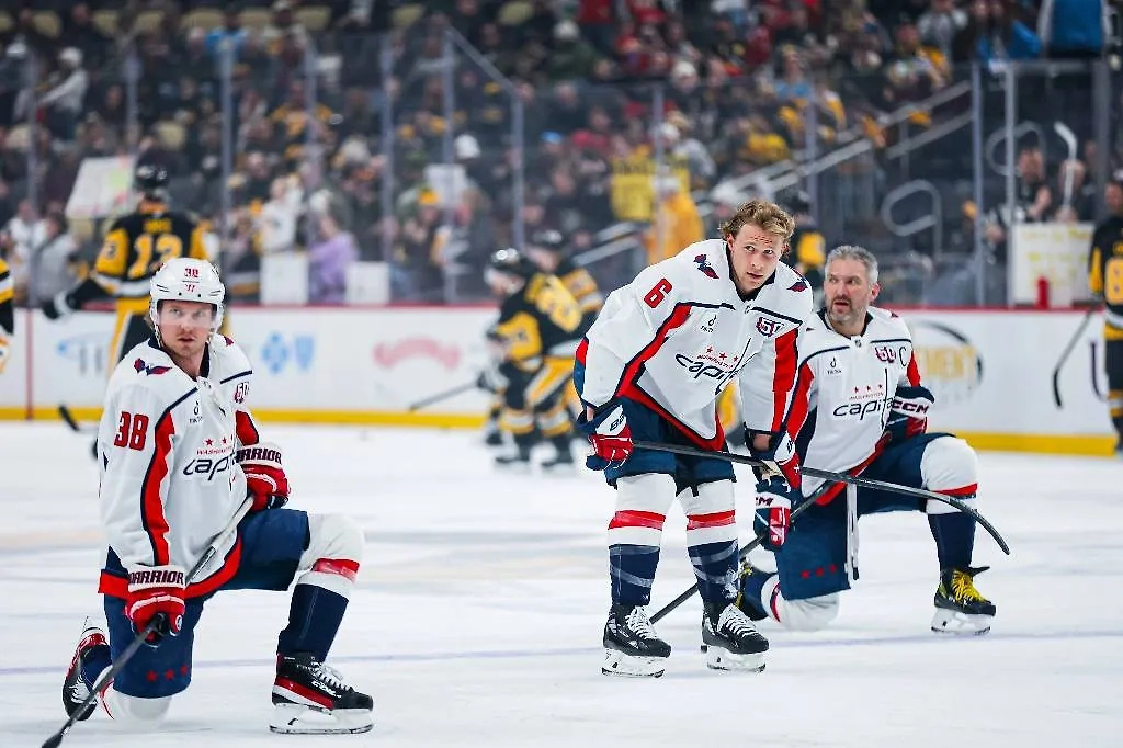 Александр Овечкин (крайний справа) остался без очков в игре с «Питтсбургом». Обложка © X / Washington Capitals
