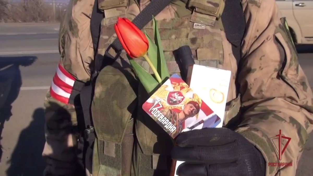 В Луганске росгвардейцы с тюльпанами и конфетами поздравили автоледи с 8 Марта