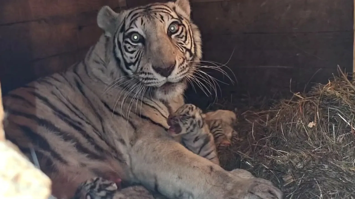 Глаза у тигрят ещё не открылись, пока они ориентируются исключительно на слух и запах. Зрение у них появится через неделю или две после рождения. Отметим, что в дикой природе белые бенгальские тигры встречаются крайне редко и считаются исчезающим видом — их численность в мире составляет от 2,5 до 3 тысяч.