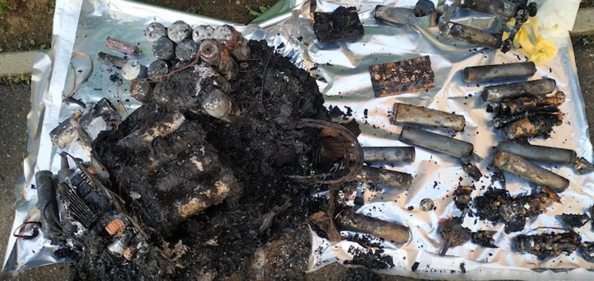 На видео представлены обломки самодельного взрывного устройства (СВУ), найденные полицией на месте происшествия. Также были обнаружены ноутбук, использовавшийся для слежки за Москаликом из машины, и мобильный телефон.