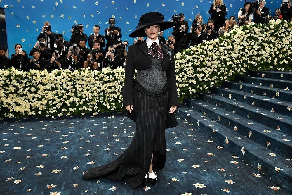Накануне в Нью-Йорке состоялся ежегодный бал, на который собираются первые звёзды США. Рианна появилась на дорожке одной из последних, зато её выход был едва ли не самым эффектным, ведь артистка показала округлившийся животик. Для светского мероприятия певица выбрала укороченный пиджак и юбку с разрезом, а живот обтянула корсетом. Её образ дополнили шляпа, остроносые туфли и галстук в горошек. Одел Рианну Marc Jacobs.