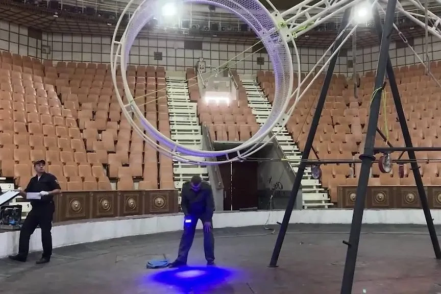 На кадрах видно, как следователи работают на цирковой арене, осматривая место происшествия, включая аттракцион, на котором девушка выполняла трюк. По предварительным данным, ответственные лица цирка проигнорировали правила охраны труда, допустив гимнастку к выполнению опасного трюка.