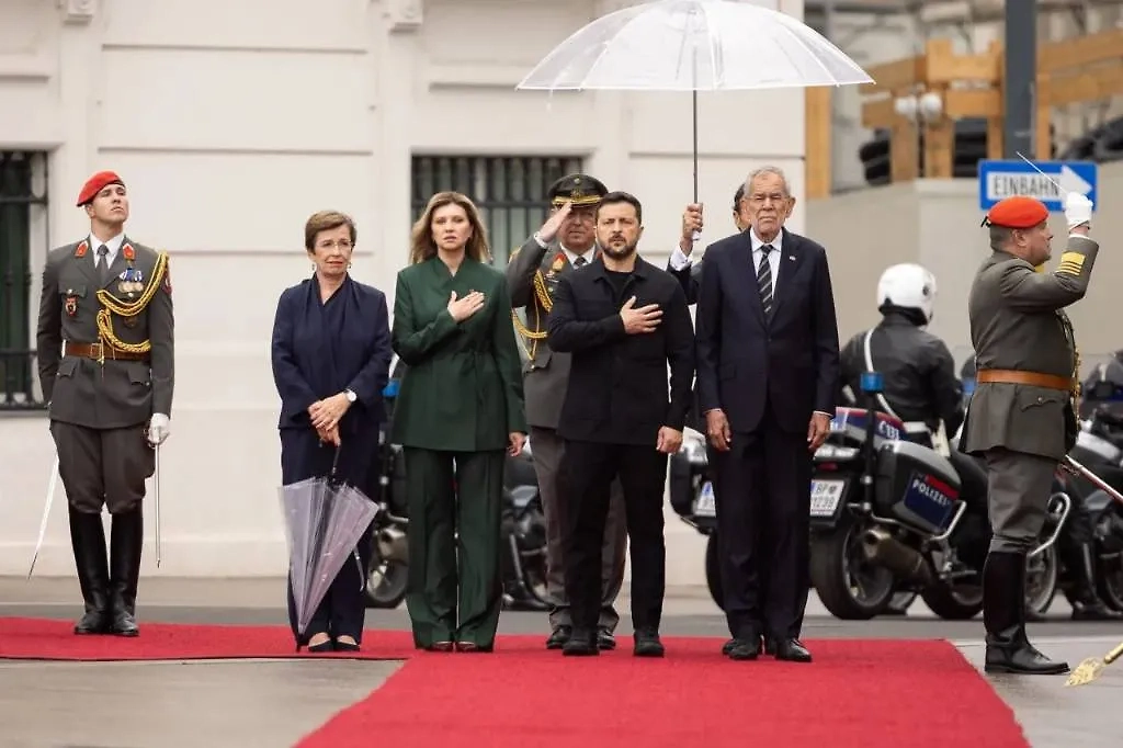 На улице шёл дождь. Чету Зеленских встречали в Вене с оркестром и красной дорожкой. Едва выйдя из своего BMW, украинский гость кинулся жать руки встречающему его австрийскому коллеге, совсем позабыв о первой леди. Елена Зеленская в элегантном костюме и на каблуках кое-как вылезла из машины и пошла вслед за мужем, который был увлечён рукопожатиями.