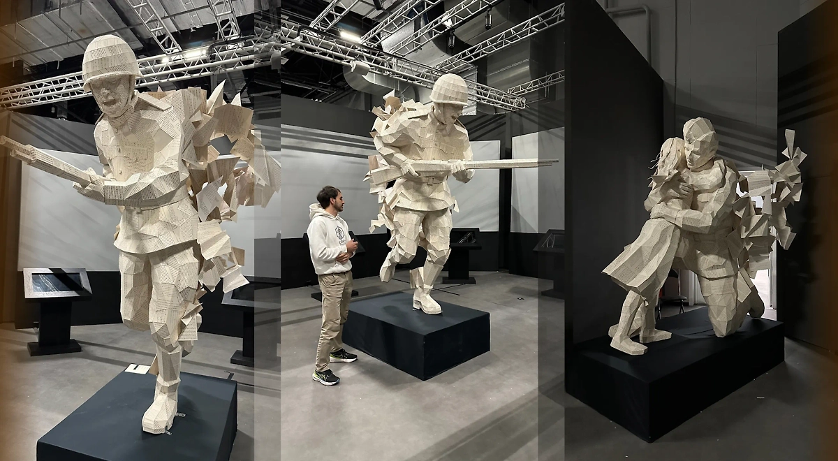 Первая скульптура из фронтовых писем — солдат, прощающийся с дочерью. Из его тела — вырываются сотни страниц. Они летят в воздухе, как души, как птицы, как память, которую невозможно удержать.