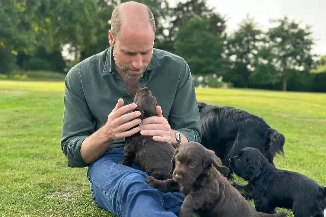 На снимке Уильям, одетый в джинсы и тёмно-зеленую рубашку, сидит на траве, окружённый щенками — потомством их любимой кокер-спаниели по кличке Орла.