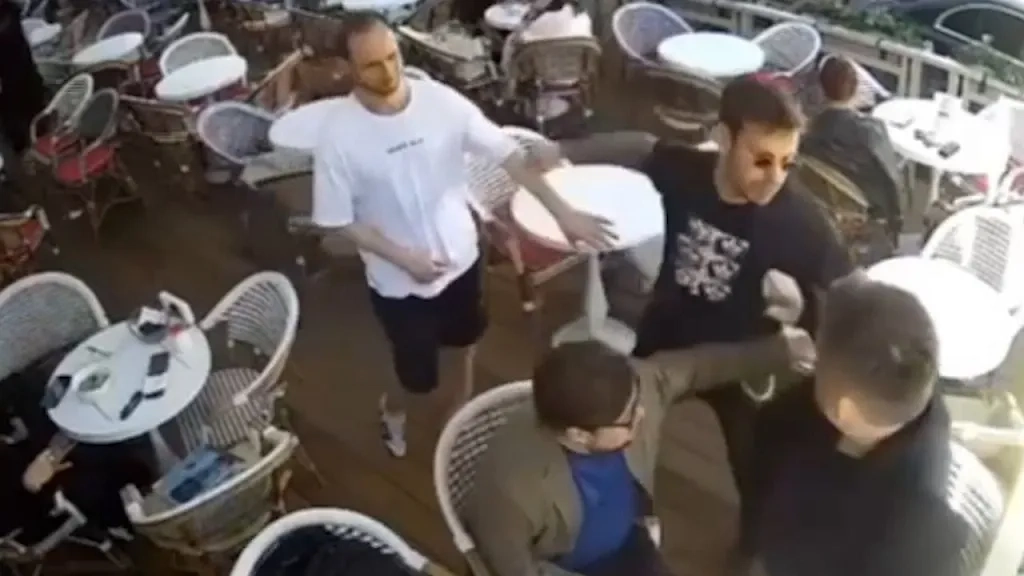 Момент нападения Смолова на неизвестных людей в кафе. Обложка © Telegram / Первый спорт
