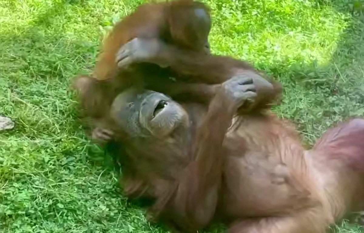 Директор Московского зоопарка Светлана Акулова поделилась умилительным видео, на котором орангутаны нежатся на солнышке. На кадрах две обезьяны с явным удовольствием катаются по траве, переворачиваются и просто отдыхают, подставив мордочки теплым лучам.