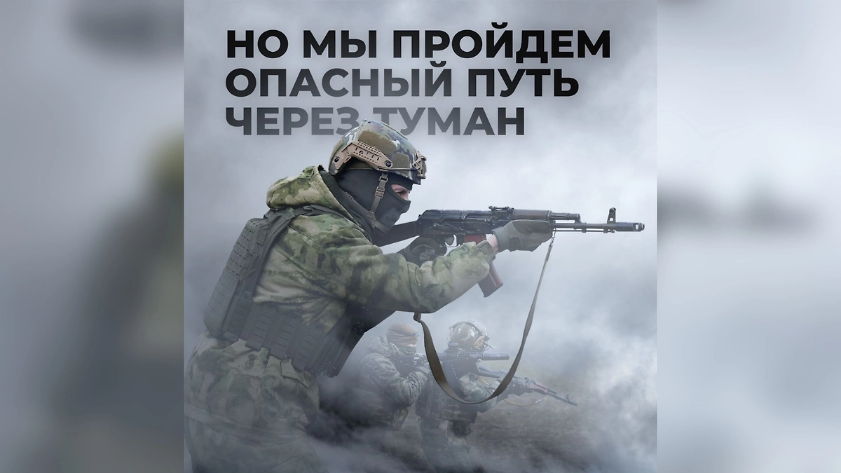 «Но мы пройдём опасный путь через туман», — указано на изображении, на котором российские бойцы с оружием наизготовку двигаются сквозь плотную пелену.