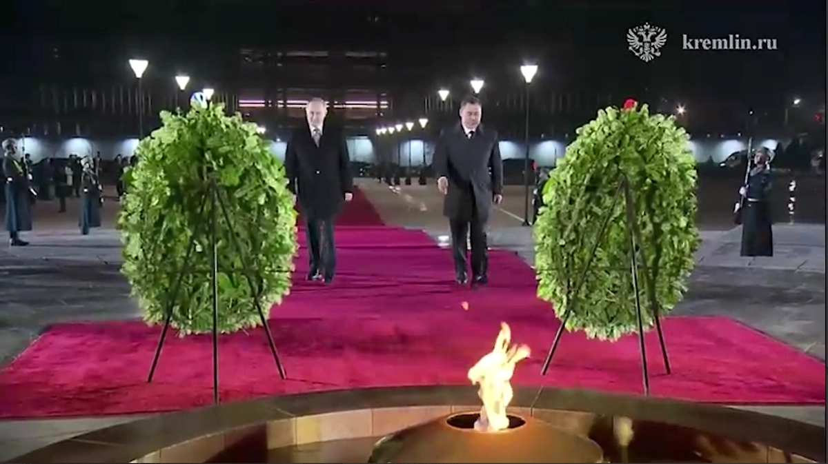 Президент Российской Федерации Владимир Путин и глава Киргизской Республики Садыр Жапаров возложили венки к мемориальному комплексу «Вечный огонь» на площади Победы в Бишкеке. Кадры публикует пресс-служба Кремля.