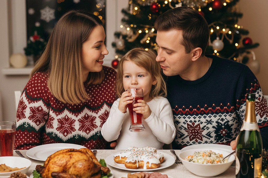 Новогодний стол для ребёнка: как избежать аллергии и переедания. Фото © Nano Banana AI