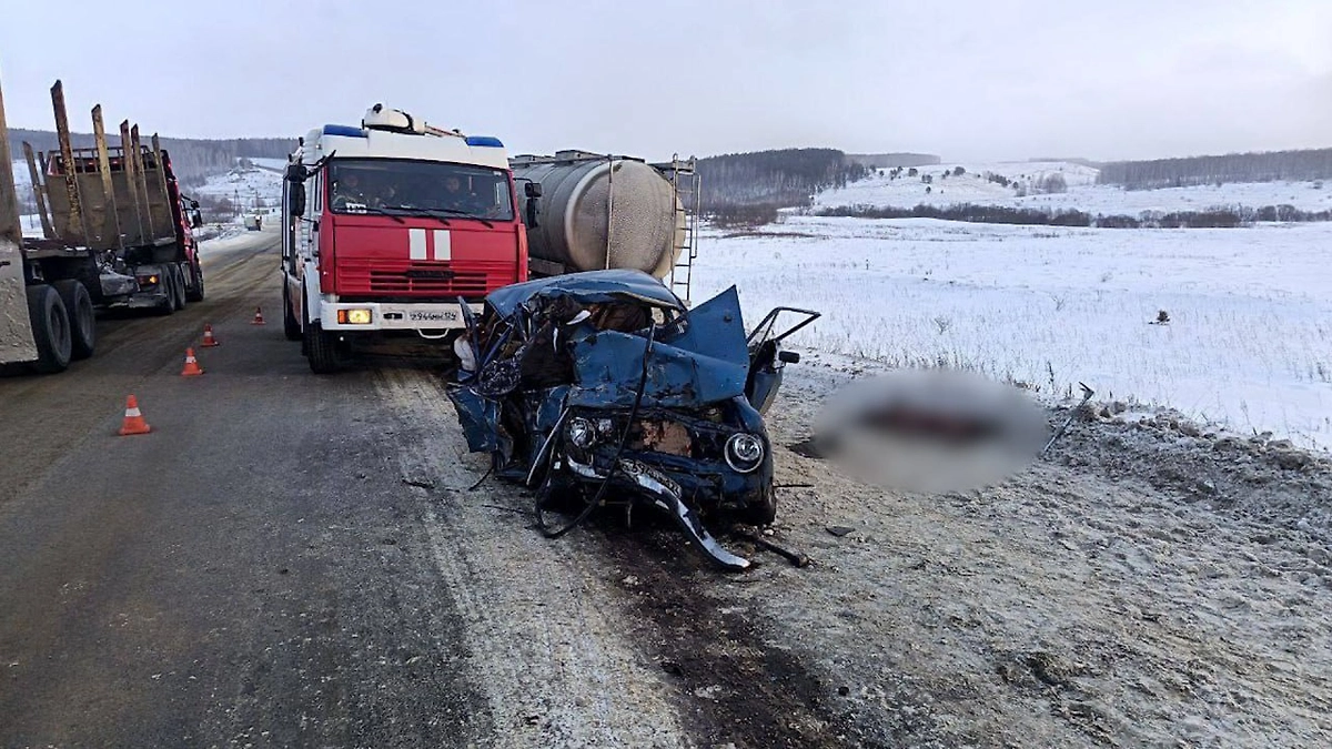Место смертельного ДТП с молоковозом и легковушкой в Красноярском крае. Обложка © Telegram / МВД 24