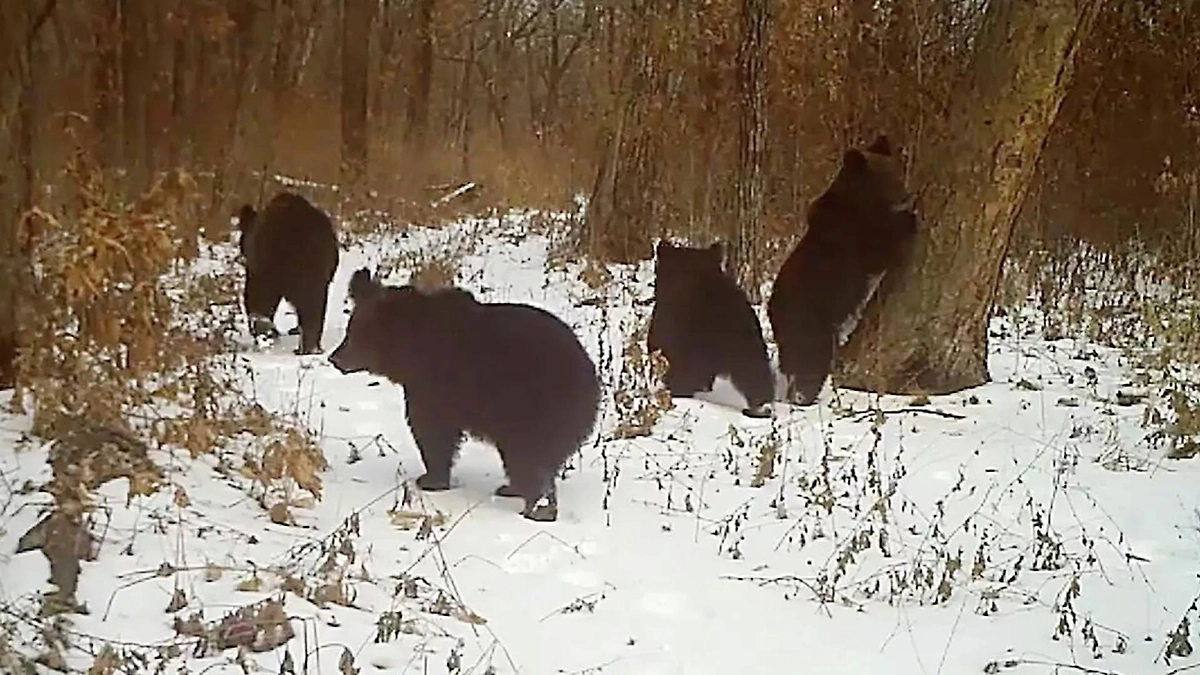 В Хинганском заповеднике Амурской области фотоловушка запечатлела четверых медвежат, чьи игры в заснеженном лесу напомнили сотрудникам знаменитое полотно «Утро в сосновом лесу». Кадры были сняты ещё в ноябре 2025 года в центральной части заповедника.