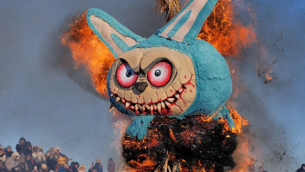 В Липецкой области на Масленицу сожгли гигантскую лабубу с кровавым ртом